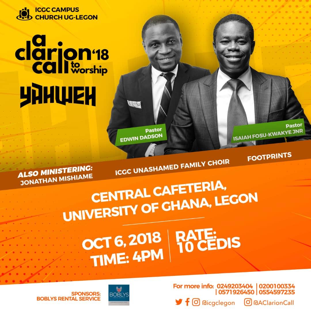 The worship night, which has been slated for Saturday October 6th will be held at the Central Cafeteria, University of Ghana under the theme “Yahweh”